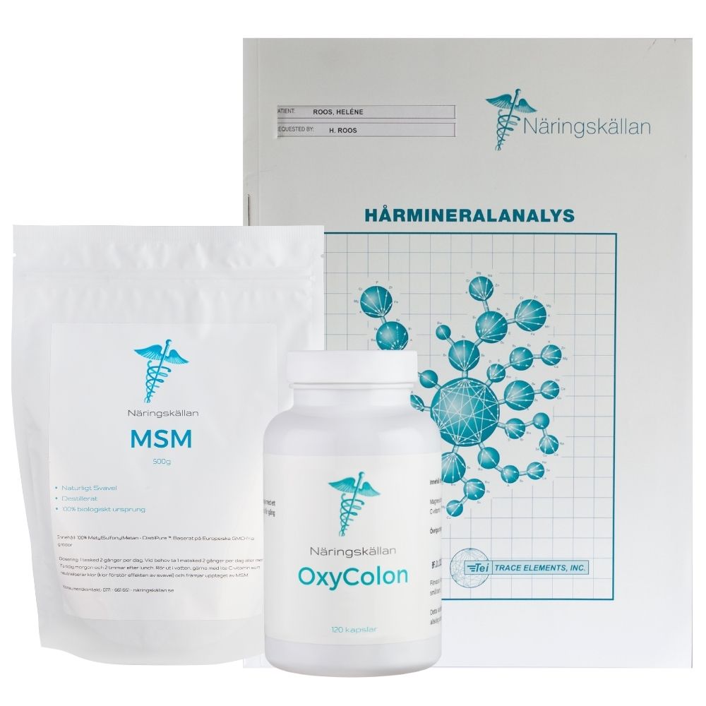 OxyColon och MSM ingår också. De stöttar kroppen med syresättning och avgiftning. En effektiv förberedelse för din balansering. Du får snabbare resultat när du gör kuren med OxyColon och svavel medan du väntar på svar från analysen.